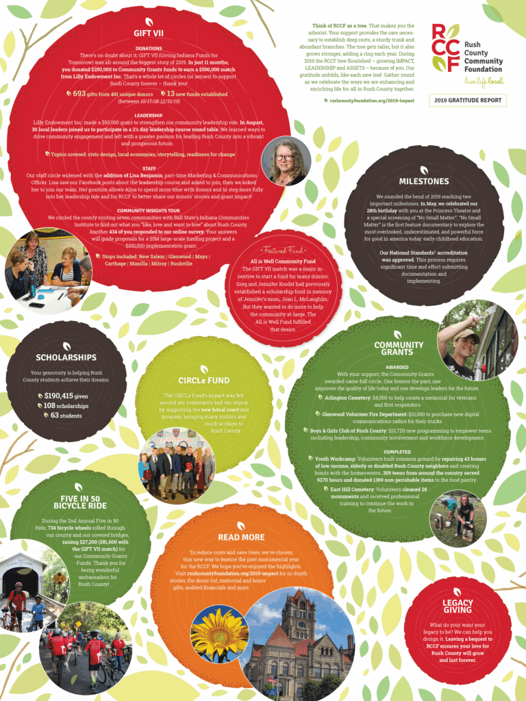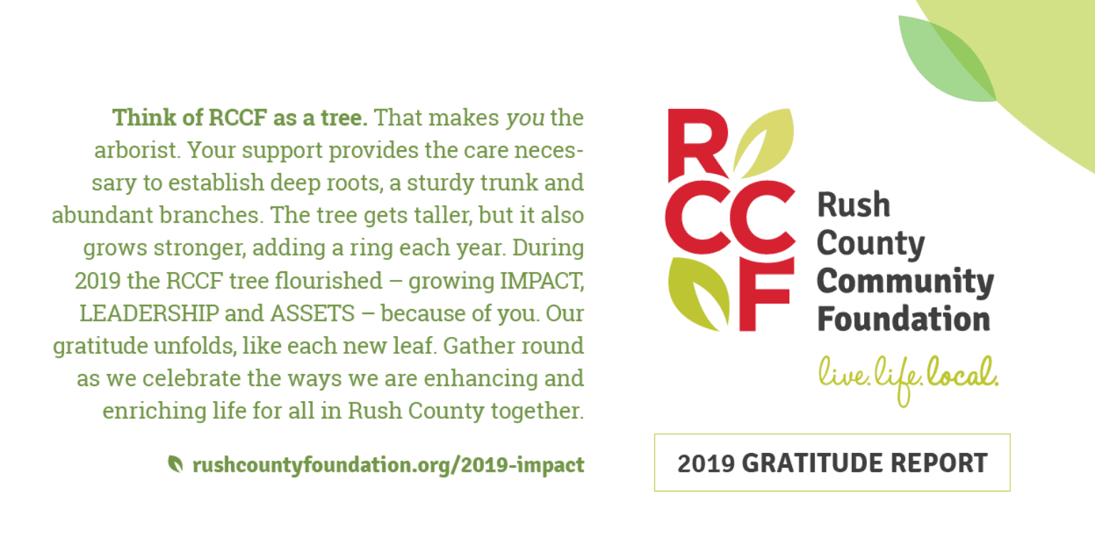 Our annual impact report looks a little different this year. To save resources and trees, we went with a much shorter format. If you didn’t receive a hard copy and would like one, please contact Angie at abane@rushcountyfoundation.org or (765)938-1177. You can also download it here.
