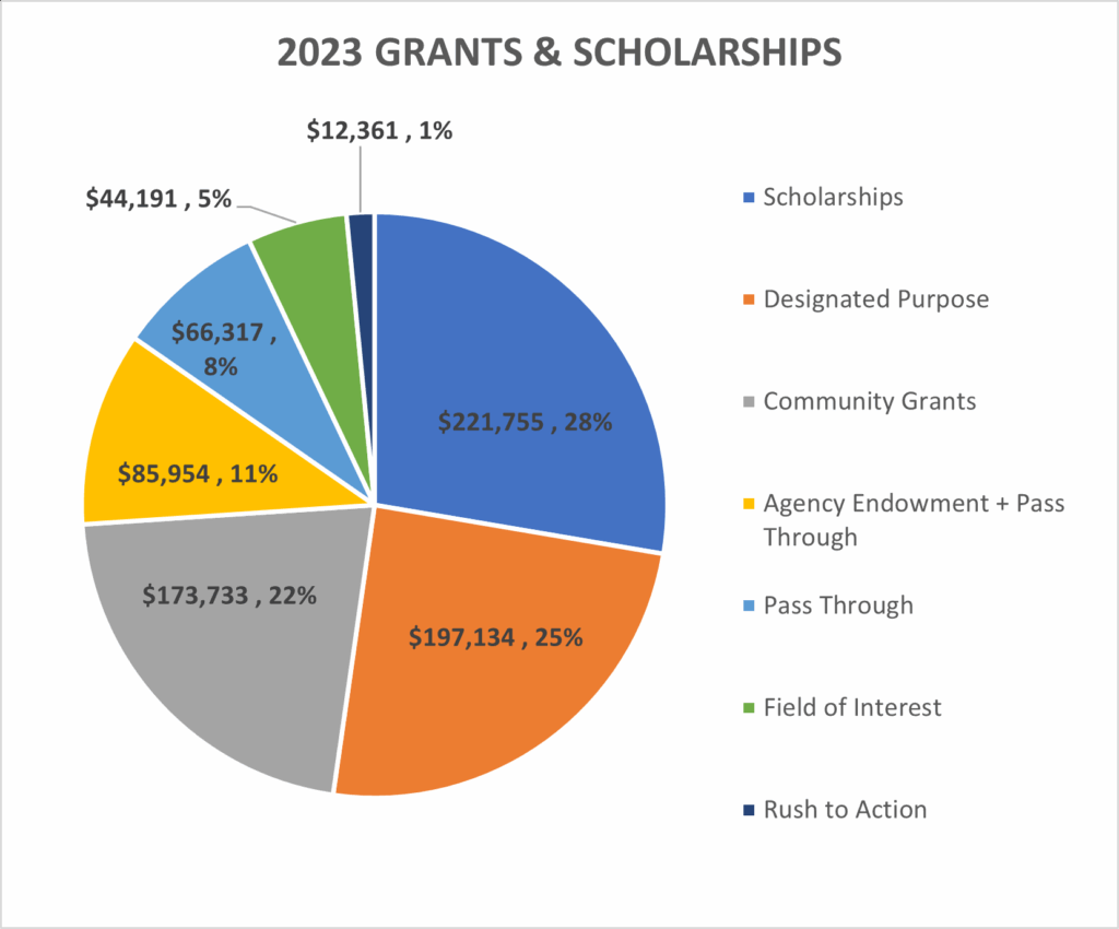 Your generosity created more than $800,000 in grants and scholarships during 2023! These funds are transforming our community $1 at a time – today, tomorrow, and forever. Here’s a quick, unaudited snapshot of the difference your gifts make.