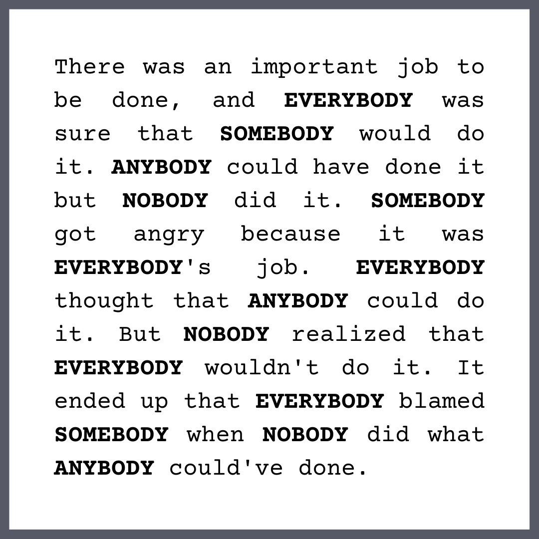 I saw this quote recently. “There was an important job to be done, and EVERYBODY was sure that SOMEBODY would do it. ANYBODY could have done it, but NOBODY did it. SOMEBODY got angry because it was EVERYBODY’s job. EVERYBODY thought that ANYBODY could do it. But NOBODY realized that EVERYBODY wouldn’t do it. It ended up that EVERYBODY blamed SOMEBODY when NOBODY did what ANYBODY could’ve done.”