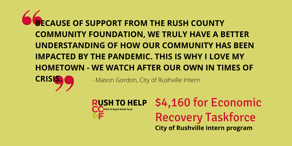 Your gifts are working hard again to help our community win the fight against this pandemic. The third Rush to Help: COVID-19 Rapid Relief Fund grant from the Rush County Community Foundation (RCCF) has been awarded to the City of Rushville to support the county-wide Economic Recovery Taskforce efforts. The money, $4,160, is being used to expand the City’s intern program, allowing the interns to begin working immediately, instead of starting in June.
