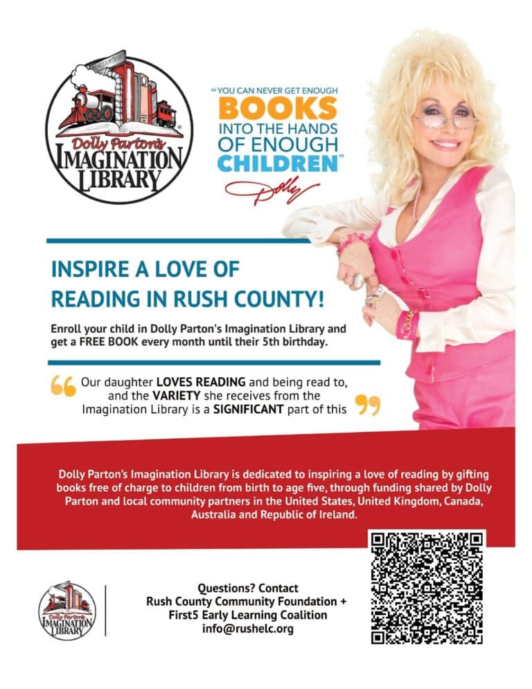 All Rush County children from birth through age 5 are eligible to sign up for Dolly Parton’s Imagination Library. This FREE program mails an age-appropriate book to your child each month until their fifth birthday. Register online or find a printable, mail-in form. Instill a love of reading and books in your little one!