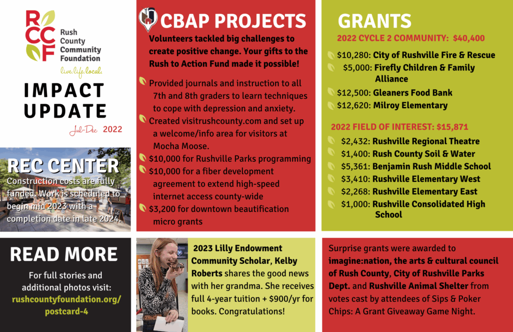 Surprise grants were awarded to imagine:nation, the arts & cultural council of Rush County, City of Rushville Parks Dept. and Rushville Animal Shelter from votes cast by attendees of Sips & Poker Chips: A Grant Giveaway Game Night. READ MORE