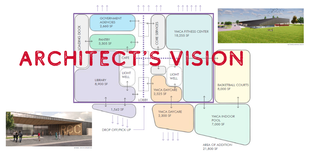 The community center we imagine has something for everyone. It will have an indoor pool, a fitness center, basketball courts, daycare, the library, a technology center, the food pantry, offices for other social services, a cafe and more. It will be a place to come together and elevate the well-being of all. It will provide health, education and recreation opportunities for our current residents. It will help attract new residents. More residents will attract new businesses that bring new jobs. Those businesses entice others bringing even more jobs and amenities. This is an investment in every aspect of our community’s future.